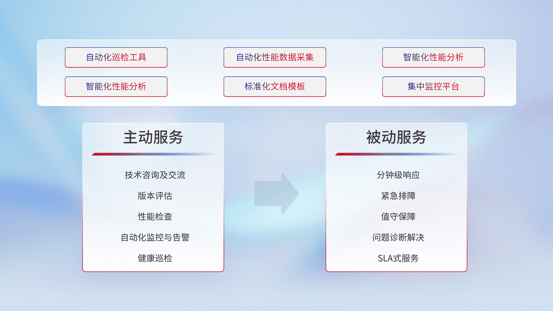 智能化工具和标准化文档,,,,保障服务质量,,,,提供主动服务(包含技术咨询、、、版本评估、、、性能检查、、、、自动化监控与告警、、、健康巡检)和被动服务包含(分钟级响应、、紧急排障、、、值守保障、、、问题诊断解决、、、SLA服务)。。。