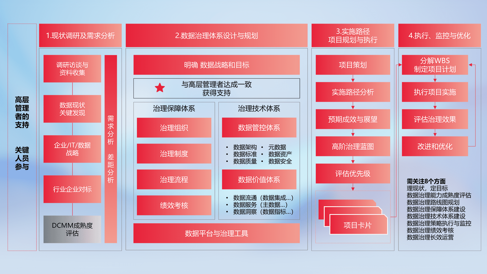制定并执行统一的数据标准,,,,规范数据定义和格式,,,,消除冗余和不一致性,,,,实现跨部门和跨系统的数据一致性,,,,为企业提供标准化的数据基础。。